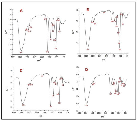 FTIR spectra of sulfated polysaccharide fractions from M. integrifolia. (A) Fraction MIF1, (B) Fraction MIF2, (C) Fraction MIF3, (D) Fraction MIF4.