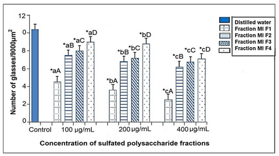 Microvascular densities at 9000 μm2 of CAM of the different fractions of sulphated polysaccharides of seaweed Macrocystis integrifolia; Data are presented as mean ± SD (n = 3). * indicates statistically significant differences (p < 0.05) between the treatments and the control, determined with the ANOVA statistic. Lowercase letters indicate statistical differences between the concentrations of the same fraction and uppercase letters indicate the statistical differences between fractions (p < 0.05) with the Tukey multirank test.
