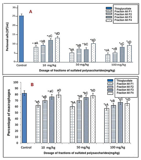 Effect of sulfated polysaccharide fractions on the cell count of the peritoneal exudate of rats; five days after intraperitoneal administration of thioglycolate. (A) Total number of cells in the peritoneal exudate. (B) Percentage of macrophages in the total cell population. Values represent the mean ± SD (n = 3). * indicates statistically significant differences (p < 0.05) between the treatments and the control, determined with the ANOVA statistic. Lowercase letters indicate statistical differences between the concentrations of the same fraction and uppercase letters indicate statistical differences between fractions (p < 0.05) with the Tukey multi-rank test.