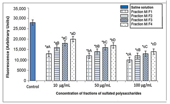 In vitro effects of M. integrifolia sulfated polysaccharide fractions on the phagocytosis of Kluyveromyces lactis cells by rat peritoneal macrophages. Values represent the mean ± SD (n = 3). The * indicates statistically significant differences (p < 0.05) between the treatments and the control, determined with the ANOVA statistic. Lowercase letters indicate statistical differences between the concentrations of the same fraction and uppercase letters indicate statistical differences between fractions (p < 0.05) with the Tukey multi-rank test.