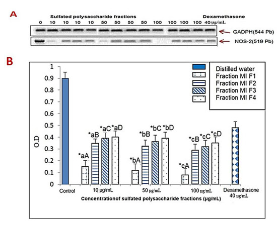 In vitro effects of sulfated polysaccharide fractions obtained from M. integrifolia algae and dexamethasone on NOS-2 mRNA levels in murine peritoneal macrophages stimulated with LPS and IFNγ, determined by RT-PCR. (A) Analysis of the RT-PCR products in the 2% agarose gel; (B) mRNA levels quantified by densitometric analysis, in all cases, expressed with respect to the value obtained for GADPH on the same gel. The bars show the mean ± SD of [DO band NOS-2/DO band GADPH], DO optical density] (n = 3). The * indicates statistically significant differences (p < 0.05) between the treatments and the control, determined with the ANOVA statistic. Lowercase letters indicate statistical differences between the concentrations of the same fraction and uppercase letters indicate statistical differences between fractions (p < 0.05) with the Tukey multi-rank test.