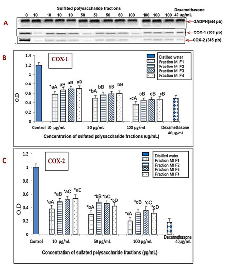 In vitro effects of M. integrifolia sulfated polysaccharides and dexamethasone on COX-1 and COX-2 mRNA levels in murine peritoneal macrophages stimulated by LPS and IFN-k, determined by RT-PCR. (A) Analysis of the RT-PCR products on 2% agarose gel; (B,C) COX-1 and COX-2 mRNA levels, respectively, quantified by densitometric analysis, in all cases expressed with respect to the value obtained for GADPH on the same gel. The bars show the mean ±SD (n = 3). * indicates statistically significant differences (p < 0.05) between the treatments and the control, determined with the ANOVA statistic. Lowercase letters indicate statistical differences between the concentrations of the same fraction and uppercase letters indicate statistical differences between fractions (p < 0.05) with the Tukey multi-rank test.
