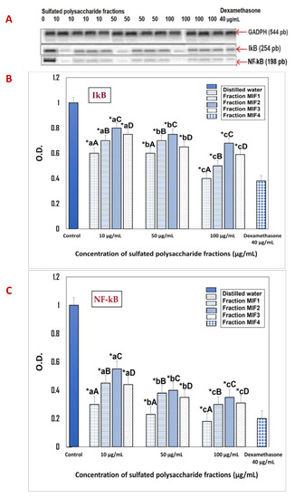 In vitro effects of M. integrifolia sulfated polysaccharides and dexamethasone on IκB and NF-κB mRNA levels in LPS- and IFNγ-stimulated murine peritoneal macrophages, as determined by RT-PCR. (A) analysis of the RT-PCR products on the 2% agarose gel; (B,C) IκB and NF-κB mRNA levels, respectively, quantified by densitometric analysis, expressed with respect to the parKa GADPH value obtained on the same gel. The bars show the mean ± SD (n = 3). * indicates statistically significant differences (p < 0.05) between the treatments +and the control, determined with the ANOVA statistic. Lowercase letters indicate statistical differences between the concentrations of the same fraction and uppercase letters indicate statistical differences between fractions (p < 0.05) with the Tukey multi-rank test.