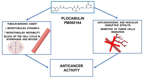 Plocabulin is a promising anticancer agent that inhibits tubulin polymerization by binding the tubulin dimer end with one of the highest known affinities. The effects of that interaction result in alterations in the dynamic instability of the microtubules, affecting cells in both interphase and mitosis, and leading to cell growth inhibition and cell death. The anticancer activity of plocabulin has been demonstrated both in vitro and in vivo. Of note, anticancer activity was also observed in tumor cells resistant to traditional chemotherapy agents (i.e., cisplatin or doxorubicin). Besides, the inhibition of microtubule dynamics in endothelial cells by plocabulin leads to alterations in tumor vascular architecture and plocabulin’s antiangiogenic effects (Figure 2).