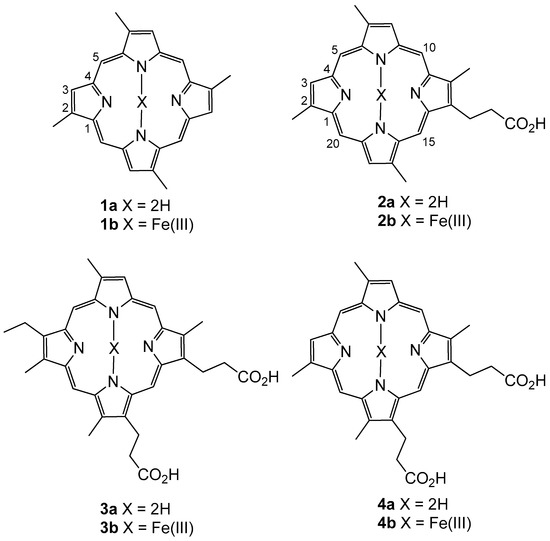 Two new free porphyrins, isabellins A (1a) and B (2a), an iron (III) coordinated porphyrin, isabellihemin A (1b), and the known compounds corallistin D (3a) and deuteroporphyrin IX (4a) were isolated from a marine sponge Isabela sp. The type-I alkyl substitution pattern of 1a, 1b and 2a was assigned unambiguously by NOESY NMR spectroscopic experiments and single crystal X-ray diffraction (Supplementary Materials). Testing of the isolated metabolites against a panel of micro-organisms and cell lines revealed potent cytotoxicity for 1a against the NS-1 and NFF cell lines that was comparable to that of the sparsomycin positive control.