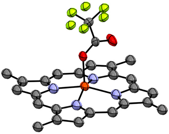 Compound 1b was isolated as a brown solid which recrystallised in chloroform to give dark brown needles. HR-ESIMS of the compound gave a molecular ion cluster [M − 2H + Fe(III)]+ with an isotopic distribution characteristic of an iron atom at m/z 420.1032, consistent with the molecular formula C24H20N456Fe+ (requires 420.1037), as well as a prominent acetonitrile adduct at m/z 461.1302 consistent with the molecular formula C26H23N556Fe+ (requires 461.1303), allowing us to conclude that we had isolated the ferric hemin counterpart to compound 1a. The 1H and 13C NMR analysis of the paramagnetic Fe(III) complex proved unproductive. Ultimately, the structure of compound 1b was assigned via single crystal X-ray diffraction as the trifluoroacetate (TFA) salt (Figure 3).