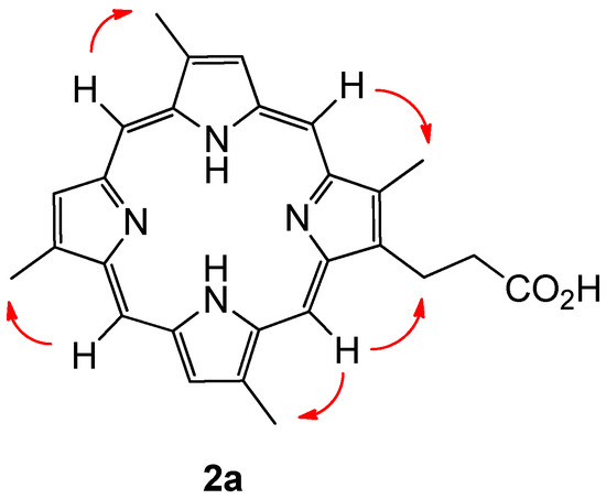 Given the capacity of the organism in question to produce porphyrins with both type-I (derived from a symmetrical APAPAPAP bearing uroporphirinogen precursor, with A = Acetyl and P = Propionyl) and type-III (derived from an asymmetrical APAPAPPA bearing uroporphirinogen precursor, featuring D-ring inversion) topology, configurational assignment of the alkyl substituents present on compound 2a became a non-trivial exercise, with one potential type-I isomer and four potential type-III isomers possible. After some consideration it became clear that a simple experiment would be able to distinguish between naturally occurring type-I and type-III configurational isomers with four methyl groups present. The method can be summarised with the conditional statement: If every meso-proton of the porphyrin macrocycle shows a 2D-NOE correlation to a corresponding methyl group, then the porphyrin must be a type-I derived porphyrin. Extending the rationale, if one meso-proton does not show a correlation to a methyl group, then the porphyrin is either a natural type-III derived porphyrin, or a type-IV porphyrin, of which there are no naturally occurring derivatives.