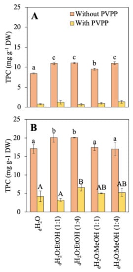 Total phenolic compounds (TPC) content before and after the use of PVPP (mg g−1 DW) of the different extractions in different solvents, including water (dH2O), dH2O:Ethanol (EtOH) (1:1), dH2O:EtOH (1:4), dH2O:Methanol (MeOH) (1:1), and dH2O:MeOH (1:4), from the biomass of (A) Asparagopsis armata and (B) Rugulopteryx okamurae. Values are expressed as average ± standard deviation (SD) (n = 3). Different letters indicate significant differences among solvents for each species (ANOVA, p < 0.05, SNK test).