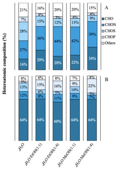 Heteroatomic composition in relative abundance of the different extractions in different solvents of water (dH2O), dH2O:Ethanol (EtOH) (1:1), dH2O:EtOH (1:4), dH2O:Methanol (MeOH) (1:1), dH2O:MeOH (1:4), from the biomass of (A) Asparagopsis armata and (B) Rugulopteryx okamurae.