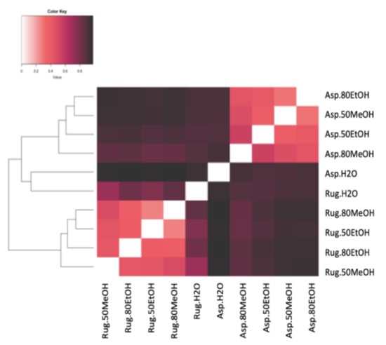 Bray–Curtis dissimilarity analyses of the different extracts in different solvents of water (dH2O), dH2O:Ethanol (EtOH) (1:1), dH2O:EtOH (1:4), dH2O:Methanol (MeOH) (1:1), and dH2O:MeOH (1:4), from the biomass of Asparagopsis armata (Asp) and Rugulopteryx okamurae (Rug). All molecular formulas detected in the different samples via FT-ICR-MS signal intensities were included, with black representing 100% similar and white 100% dissimilar.