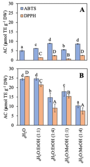 Antioxidant capacity (AC) using two methodologies expressed as μmol TE g−1 DW of the different extracts in different solvents of water (dH2O), dH2O:Ethanol (EtOH) (1:1), dH2O:EtOH (1:4), dH2O:Methanol (MeOH) (1:1), and dH2O:MeOH (1:4), from the biomass of (A) Asparagopsis armata and (B) Rugulopteryx okamurae. Values are expressed as average ± standard deviation (SD) (n = 3). Different letters indicate significant differences among solvents for each species (ANOVA, p < 0.05, SNK test).