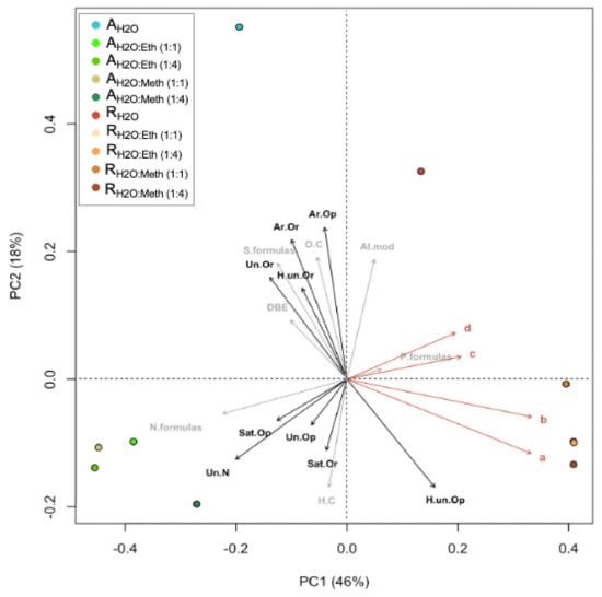 In PCoA analysis, samples were correlated to nine chemical/bioactive parameters (Figure 5). In the ordination plots, the first two axes explained 64% of the algal extract’s molecular variability. In PCoA, the projection of sample points onto the vectors depicts correlations with the corresponding molecular/bioactivity parameters. PCoA and cluster analyses revealed two molecular clusters in relation to the two species evaluated and two independent samples, which correspond to the dH2O extracts. The R. okamurae cluster correlated strongly with phenolic compounds (both no PVPP and PVPP) and antioxidant capacity (both ABTS and DPPH) (Figure 5). R. okamurae extracts correlated with highly unsaturated (O poor) molecules. A. armata extracts correlated with C/Hw, N formulas, unsaturated (O poor and with N), and saturated (O rich and O poor). The R. okamurae dH2O extract correlated significantly with AImodw, whereas the A. armata dH2O extract correlated with S-enriched formulas, O/Cw ratio, DBEw, aromatics (O rich and O poor), highly unsaturated (O rich) and unsaturated (O rich).