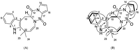 A close inspection of the 1H and 13C NMR data of 1 (Table 1; Figures S3–S9) by DEPT and HSQC revealed the presence of an amide proton (δH 8.05), two methyl groups (δH 1.40, δC 32.4, δH 1.67, δC 26.4), one sp3 methylene (δH 3.60, 3.78, δC 28.0), one sp3 (δH 4.52, δC 60.7), nine olefinic methines (δH 5.88, δC 142.6, δH 5.91, δC 121.3, δH 3.07, δC 115.1, δH 6.60, δC 118.7, δH 6.90, δC 119.7 δH 6.96, δC 121.4, δH 7.12, δC 110.2, δH 7.20, δC 118.7, δH 7.31, δC 117.3), five sp2 (δC 103.0, 124.9, 127.9, 134.2 and 141.0), and one sp3 (δC 37.7) quaternary carbons, as well as two amide carbonyls (δC 156.0 and 164.7).