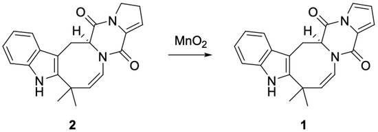 In order to confirm the absolute configuration of the isolated deoxy-14,15-dehydroisoaustamide (1), we performed a counter synthesis of 1 from the previously isolated (+)-deoxyisoaustamide (2) [3]. Thus, refluxing of (+)-deoxyisoaustamide (2) in methylene chloride in the presence of active manganese (IV) oxide [11] for 48 h gave deoxy-14,15-dehydroisoaustamide (1) with a yield of 30% (Figure 2). All spectral data of the synthesized sample coincided with those for the isolated natural compound 1. Note this rection reflects a suggested biosynthetic pathway for compound 1, which is proposed as an enzyme-catalyzed dehydration of (+)-deoxyisoaustamide (2).