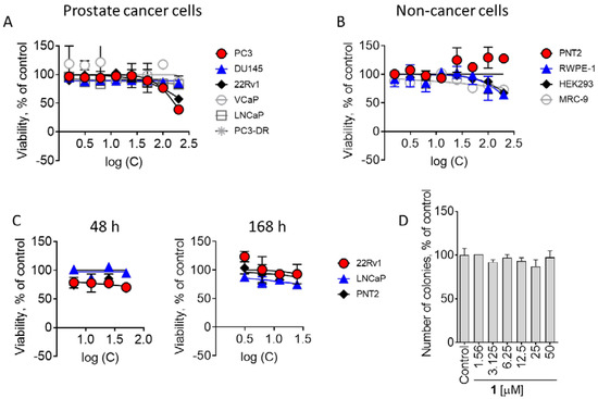 Cytotoxicity of 1 in prostate cancer and non-cancerous cells. (A,B), Viability of prostate cancer (A) and non-cancer (B) cell lines measured using a MTT assay after 48 h of treatment. (C), Viability of prostate cancer cell lines measured using a trypan blue exclusion assay. Cells were treated with compound 1 for 48 h or 168 h. (D), Colony formation assay. 22Rv1 cells were exposed to the indicated concentrations of compound 1 for 48 h; then, the drug-containing media was removed, fresh drug-free medium was added. After additional 14 days of incubation, formed colonies were fixed, stained and counted by naked eye.