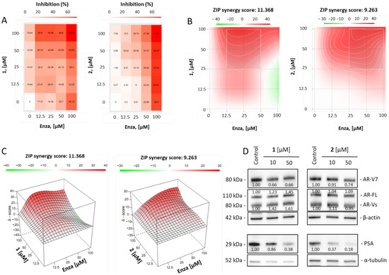 Combinational treatment of 22Rv1 cells with compounds 1 or 2 and enzalutamide (Enza). (A–C), 22Rv1 cells were treated with 1, 2, Enza or combinations 1 + Enza or 2 + Enza for 48 h. Cell viability was determined using MTT assay. (A), The heat-map shows the cytotoxic effect (in %) of compound 1, 2, Enza and combinations. (B,C), SynergyFinder 2.0 software and a ZIP reference model were used to calculate and visualize the combinational effect (synergism/additive effect/antagonism) in 2D (B) or 3D (C). Red regions indicate synergism, white regions refer to additive effect and green regions indicate antagonism. (D), Expression of proteins involved in AR-signaling pathway in 22Rv1 cells after 48 h of treatment. The protein expression was measured by Western blotting. β-actin or α-tubulin were used as a loading control. The band intensity was quantified using Image Lab v. 6.1.0. software and normalized to loading control.