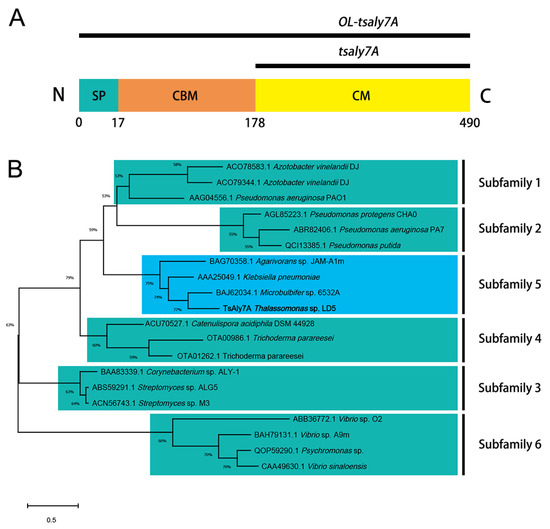 One predicted alginate lyase gene, tsaly7A, was detected and cloned from Thalassomonas sp. LD5, composed of 939 bp, encoding 312 amino acid residues. It only contained a catalytic module (CM) as shown in Figure 1A. The original length of tsaly7A (OL-tsaly7A) had a signal peptide (SP) at the N-terminal end with a length of 17 amino acid residues, a carbohydrate binding module (CBM) at middle with a length of 161 amino acid residues and a CM at C-terminal end (Figure 1A). The theoretical molecular weight of TsAly7A was 34.39 kDa and theoretical pI was 4.57. The sequence data were deposited in GenBank with accession No. OM672104.1. According to the results of Protein BLAST search, the similarity rate between TsAly7A and AlgMsp of PL7 family from Microbulbifer sp. 6532A [27] was 71%, indicating that TsAly7A was a new member of PL7. Further phylogenetic analysis proved that TsAly7A belonged to the fifth subfamily of PL7 (Figure 1B).