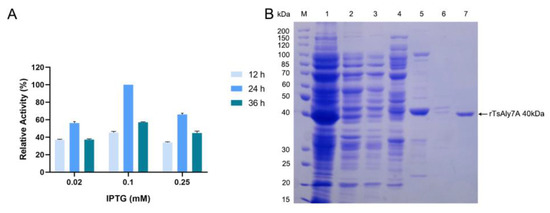 (A) Expression and purification of rTsAly7A. Relative enzyme activity of TsAly7A under different induction conditions. (B) SDS-PAGE of rTsAly7A. Lane M, protein standard marker; lane 1, crude enzyme; lane 2, flow-through; lane 3, elution by 0 mM imidazole; lane 4, elution by 25 mM imidazole; lane 5, elution by 75 mM imidazole; lane 6, elution by 150 mM imidazole; lane 7, elution by 300 mM imidazole, purified rTsAly7A.