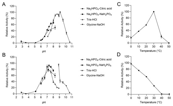 Biochemical properties of rTsAly7A. Optimal pH (A), pH stability (B), optimal temperature (C), thermal stability (D) of the rTsAly7A. The relative activity of 100% in (A,C) was determined at optimal condition. The original activity of 100% in (B,D) was determined before incubation at optimal condition.
