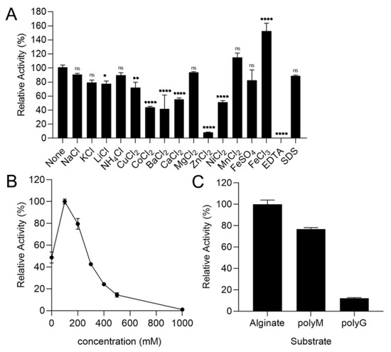 Effects of metal ions, chelator, and surfactant (1 mM) (A) and effects of NaCl concentrations (0–1 M) (B) on the activity of rTsAly7A. The substrate specificity of rTsAly7A (C). The relative activity of 100% was determined at optimal condition. **** for p < 0.0001, ** for p < 0.01, * for p < 0.05, ns for not significant.