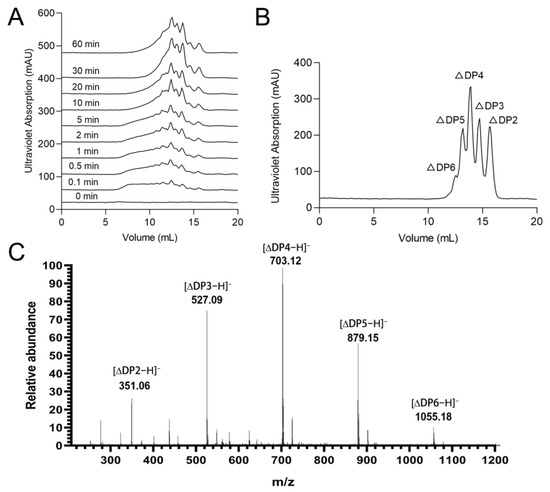 Degradation mode and end-products of rTsAly7A. The time-course of alginate degradation by rTsAly7A (A). SEC analysis of end-products of rTsAly7A (B). Mass spectra analysis of final product of rTsAly7A (C). ∆DP2, unsaturated alginate disaccharide.