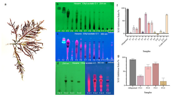 The TLC fingerprints and XOD-inhibitory activity of the crude extract and fractions of Pterocladiella capillacea. (a) The image of the seaweed material P. capillacea. (b–e) The TLC images of fractions F1–F12, F4-1–F4-4, and crude extract detected under 254 nm and 365 nm UV light, respectively (sample numbers are marked below the start line). (f,g) The XOD inhibition rates of fractions F1–F12, F4-1–F4-4, crude extract, and allopurinol.