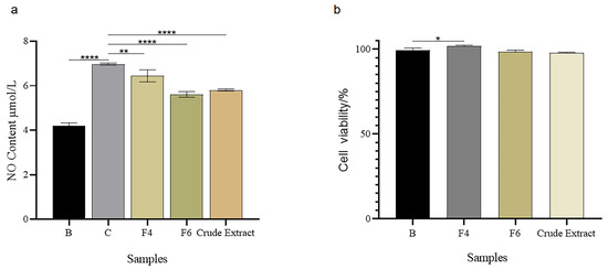 As shown in Figure 2a, the NO production in the RAW264.7 cells of the control group (C) significantly increased compared with the blank group (B) (p < 0.001) under the stimulus of lipopolysaccharide (LPS), while samples F4 and F6, and the crude extract can significantly decrease the NO production at a dose of 20 μg/mL. Meanwhile, F4, F6, and the crude extract did not show toxicity to the cells at this dose (Figure 2b). This result was consistent with that of XOD inhibition activity, indicating that these samples also possess anti-inflammatory activity.