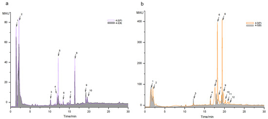 Among them, the peak heights of peak 1, peak 2, peak 5, and peak 8 of F4-2 in the process group 4-2(P) after affinity ultrafiltration treatment were remarkably higher than those of the inactivated enzyme blank group 4-2(B) (Figure 3a). More dramatically, in sample F4-3, more peaks, including peaks 5, 6, 7, 8, 9, 10, 11, and 12, were observed in the process group 4-3(P), with much stronger intensity than in the blank group 4-3(B) (Figure 3b). The peaks were assumed to be the substances in P. capillacea that specifically interact with xanthine oxidase.