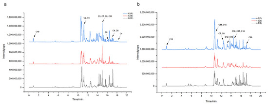 The LC-MS traces (base peak chromatographies, BPC) for the fraction samples 4-2 and 4-3 under positive ion mode of the ultrafiltration membrane-retained samples after incubation with XOD or inactivated XOD ultrafiltration (the chromatograms were monitored under 290 nm). (a) The comparison of affinity ultrafiltration process group (4-2(P)), inactivated enzyme blank group (4-2(B)), and crude sample group (4-2(C)) for sample F4-2. (b) The comparison of affinity ultrafiltration process group (4-3(P)), inactivated enzyme blank group (4-3(B)), and crude sample group (4-3(C)) for sample F4-3.