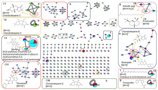 The FNMB molecular network for the fraction sample 4-2 based on positive ion MS/MS spectral similarity. Sub-figures (a–i) show the details of the amplified clusters including the annotated compounds 1–11 (C1–C11), respectively. The nodes display the measured average masses of the molecular ions with identical MS/MS spectra. The sizes of the nodes reflect the relative amount of the corresponding compounds. The different colors of sections in the nodes represent different sample groups, i.e.,