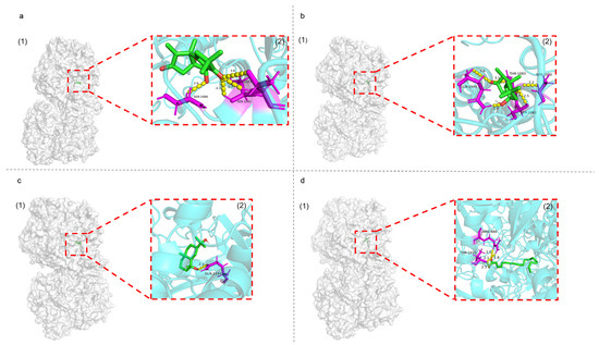 Molecular docking results of Chondroterpene B (a), Chondroterpene E (b), Proximadiol (c), and Octadeca-2,4,6,8-tetraenoic acid (d), respectively, with XOD. Docking pose (1) and ligand interaction (2) diagrams of different ligands and XOD are presented for each docking result. Yellow dotted lines indicate hydrogen bonds.