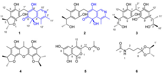 Compound 1 was isolated as a yellow powder. It was assigned a molecular formula C24H27NO6 due to its HRESIMS peak at m/z 424.1759 [M−H]−, requiring 12 degrees of unsaturation (DOU). The 1H and 13C NMR spectroscopic data (Figures S1 and S2, Table 1) revealed the presence of six methyls [δH 1.25 (3H, dd, J = 6.1 Hz, 1.7 Hz, 10-Me), 1.19 (3H, d, J = 6.8 Hz, 11-Me), 2.05 (3H, s, 12-Me), 2.67 (3H, s, 11′-Me), 2.70 (3H, s, 12′-Me), 1.60 (3H, s, 13′-Me); δC 21.2 (q, C-10), 19.8 (q, 11-Me), 12.3 (q, C-12), 20.0 (q, C-11′), 16.7 (q, C-12′), 29.3 (q, C-13′)]; one methylene [δH 3.70 (dd, J = 14.2 Hz, 2.4 Hz, H-1″), 3.60 (dd, J =14.2 Hz, 4.4 Hz, H2-1″); δC 20.2 (t, C-1″)]; three methines [δH 4.30 (dq, J = 6.1 Hz, 3.9 Hz, H-2); δH 2.90 (dq, J = 6.8 Hz, 3.9 Hz, H-3), 8.86 (s, H-10′); δC 87.6 (d, C-2), 45.3 (d, C-3), 137.6 (d, C-10′)]; fourteen non-hydrogenated carbons, including twelve olefinic [δC 130.4 (s, C-4), 114.0 (s, C-5), 148.0 (s, C-6), 117.6 (s, C-7), 138.2 (s, C-8), 140.9 (s, C-9), 155.8 (s, C-2′), 135.8 (s, C-3′), 159.0 (s, C-4′), 112.6 (s, C-7′), 175.3 (s, C-8′), 128.0 (s, C-9′)], one sp3 [δC 74.7 (s, C-5′)]; and one ketone at δC 196.2 (s, C-6′). Diagnostic HMBC correlations observed from H3-11 to C-2/3/4, H3-12 to C-4/5/6, H2-1″ to C-6/7/8, and from H-2/3 to C-9, together with the COSY cross-peaks H-2/H3-10/H-3/H3-11, supported a 2,3,5-trimethyl-6,8-dihydrobenzofuran fragment, A [49]. Another fragment, B, was recognized as an isoquinocitrinin owing to the HMBC correlations of H3-11′/C-2′/3′; H3-12′/C-3′/C-2′ and C-4′, H3-13′/C-5′/C-4′ and C-6′, H3-10′/C-2′ and C-4′/C-9′; as well as H-1″/C-6′/C-7′/C-8′ [50]. The HMBC cross-peaks to both fragments, starting from H2-1″, thus established the CH2 linkage between A and B (Figure 2).