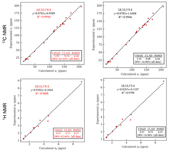 NMR calculation for compound 1: regression analysis of experimental and calculated 13C and 1H NMR chemical shifts for 2R*,3S*,5′R*-1 and 2R*,3S*,5′S*-1, with the probability of each isomer analyzed by DP4+ analysis included.