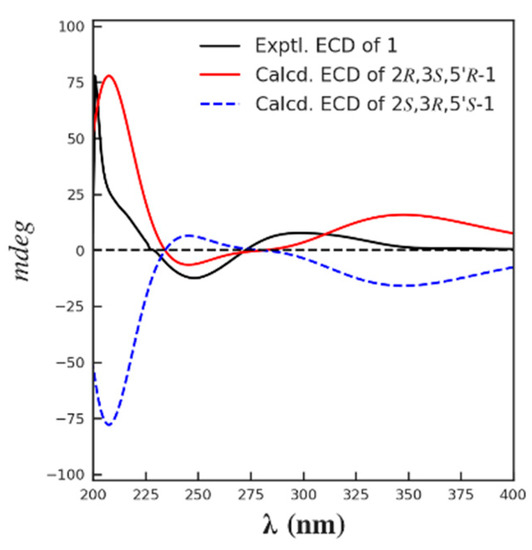 The relative configuration of 1 was partially determined by NOESY experiments. The correlations observed from H-2 to H3-11 and H-3 to H3-10 indicated that 3-Me and 2-Me are trans-configured (Figure 2). To furtherly determine the relative configuration between C-5′ and C-2/3, we performed a quantum chemical calculation of NMR data for the two possible isomers of 1, 2R*,3S*,5′R* and 2R*,3S*,5′S*, along with a DP4+ probability analysis. As a result, the theoretical prediction of the chemical shift of the former showed a better correspondence with the experimental data, with an average probability of 83.04% (Figure 3). Finally, the absolute configuration of 1 was established by a TD-DFT based ECD calculation of the two enantiomers of 1 at the B3LYP/6-31+g (d, p) level, as well as comparison with the experimental data, which indicated the correct configuration as 2R,3S,5′R (Figure 4). Hence, the complete structure of 1 was assigned as shown and named citriquinolinone A. Of note, citriquinolinone A (1) represents the first exemplar of an isoquinolinone–citrinin hybrid.