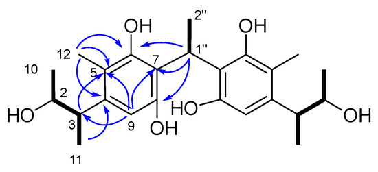 Compound 3 was isolated as a yellow oil and assigned the molecular formula C24H34O6, based on the HRESI(-)MS peak at m/z 441.2250 [M+Na]+, requiring eight DOU. The 1H, 13C NMR, and DEPT spectroscopic data (Figures S15–S20 and Table 2) revealed the presence of 24 carbons, including seven methyls, seven methines, and 10 quaternary carbons. In the 13C NMR spectrum, all the carbon signals, except the C-1″ (δC 27.7, CH) and C-2″ (δC 17.8, CH3) examples, existed in pairs, suggesting that 3 was likely a dimeric compound. The comparison of the 1D and 2D NMR data of 3 with those of 16 showed that they closely resembled each other, with the primary difference being the replacement of a methylene in 2 with a methine and methyl in 3. Further confirmation was obtained using the COSY correlations of H3-10 (δH 1.10, d, J = 6.3 Hz)/H-2 (δH 3.80, dq, J = 6.5, 6.3 Hz)/H-3 (δH 3.02, dq, J = 6.8, 6.5 Hz)/H3-11 (δH 1.12, d, J = 6.8 Hz), and HMBC cross-peaks from H3-12 (δH 2.10, s) to C-4 (δC 143.2 s) C-5 (δC 117.6 s) and C-6 (δC 154.6 s), H3-11 to C-4 (δC 143.2 s), H-9 (δH 6.37, s) to C-3 (δC 42.9 s), C-5, and C-7 (δC 116.7 s). The COSY correlations of H-1″ (δH 4.9, m)/H3-2″ (δH 1.80, d, J = 7.5 Hz), along with the diagnostic HMBC correlations from H-2″ to C-7, H-1″ to C-6, C-7 and C-8 (δC 152.9 s), proved that the linkage between the two monomers were C-1″-2″, thereby assigning the planar structure of 3, as shown in Figure 7.