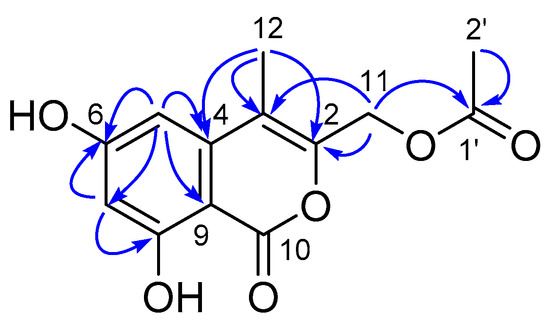 (6,8-Dihydroxy-4-methyl-1-oxo-1H-isochromen-3-yl) methyl acetate (5): Yellow amorphous solid; 1H and 13C NMR data, see Table 3; HRESIMS m/z 263.0547 [M−H]− (calcd for C13H11O6, 263.0556, ΔmDa −0.9).