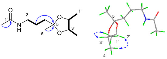 Compound 6 was obtained as a yellow oil. Its molecular formula was established as C11H21NO3 on the basis of the pseudo molecular ion at m/z 238.1435 [M + Na]+ in its HRESI(+)MS spectrum, requiring two degrees of unsaturation. The 13C NMR spectrum, in association with the DEPT spectrum, indicated 11 carbon signals ascribed to four methyls (δC 23.3 q, C-2″; 17.2 q, C-1′; 16.4 q, C-4′; and 25.8 q, C-6), two sp3 methylenes (δC 37.6 t, C-4; 23.7 t, C-3; and 39.6 t, C-2), two sp3 methines (δC 78.0 d, C-2′ and δC 79.0 d, C-3′), one sp3 quaternary carbon (δC 108.8 s, C-5), and one carbonyl (δC 170.0 s, C-1″). The 2D NMR spectra revealed COSY correlations of H2-2 (δH 3.25, dd, J = 12.7, 6.4 Hz)/H2-3 (1.67, m; 1.62, m)/H2-4 (1.66, m), H3-1′ (δH 1.23, d, J = 5.8 Hz)/H-2′ (δH 3.68, m)/H-3′ (δH 3.56, m)/H-4′ (δH 1.24, d, J = 5.7 Hz). These, along with the HMBC correlation from H2-3 and H3-6 (δH 1.30, s) to C-5, allowed for the assignment of the planar structure, as shown in Figure 11. For the stereochemistry, the key NOESY correlations of H3-1′/H-3′ and H3-4′/H-2′ established a trans-relationship between the two methyls. Additionally, a DFT calculation of the OR value of the two possible enantiomers was performed, in which the predicted OR of the 2’S3’S isomer showed the same sign as the experimental result (Table 4). Therefore, 6 was determined as N-(3-((2′S,3′S)-2′,3′,5′-trimethyl-1,3-dioxolan-2-yl)propyl)acetamide.
