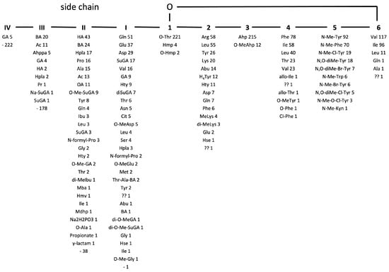 General structure of cyanopeptolin variants with residues occupying a given position (Abu—2-amino-2-butenoic acid; Ac—acetate; Ahp—3-amino-6-hydroxy-2-piperidone; Ahppa—2-amino-5-(4′-hydroxyphenyl)pentanoic acid; BA—Butanoic acid; Cit—Citrulline; GA—Glyceric acid; H4Tyr—Tetrahydrotyrosine; HA—Hexanoic acid; Hmp—3-hydroxy-4-methyl-proline; Hmv—2-hydroxy-3-methylvaleric acid; Hpla—Hydroxy-phenyl lactic acid; Hse—Homoserine; Hty—Homotyrosine; Ibu—Isobutyric acid; Kyn—Kynurenine; Mba—Methyl-2-butenoic acid; Mdhp—Methyl-dehydroproline; OA—Octanoic acid; Pr—Propanoyl; Su—Sulfo).