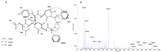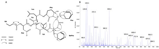 Key TOCSY, ROESY, and HMBC correlations (A) and enhanced product ion mass spectrum of the cyanopeptolin CP 919 with precursor ion [M + H − H2O]+ at m/z 902.5 (B).