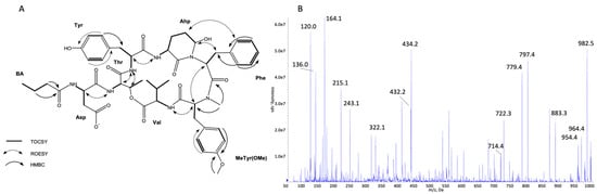 Key TOCSY, ROESY, and HMBC correlations (A) and enhanced product ion mass spectrum of the cyanopeptolin CP 999 with precursor ion [M + H − H2O]+ at m/z 982.5 (B).