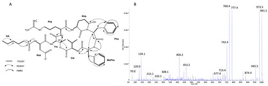 Key TOCSY, ROESY, and HMBC correlations (A) and enhanced product ion mass spectrum of the cyanopeptolin CP 990 with precursor ion [M + H]+ at m/z 991.5 (B).