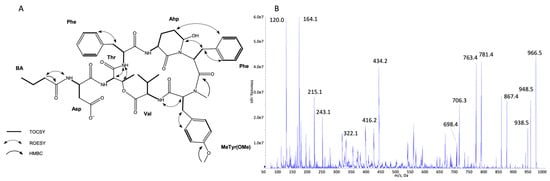 Key TOCSY, ROESY, and HMBC correlations (A) and enhanced product ion mass spectrum of the cyanopeptolin CP 983 with precursor ion [M + H − H2O]+ at m/z 966.5 (B).