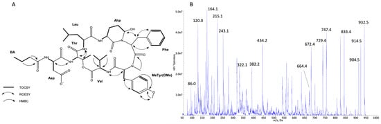 Key TOCSY, ROESY, and HMBC correlations (A) and enhanced product ion mass spectrum of the cyanopeptolin CP 949 with precursor ion [M + H − H2O]+ at m/z 932.5 (B).