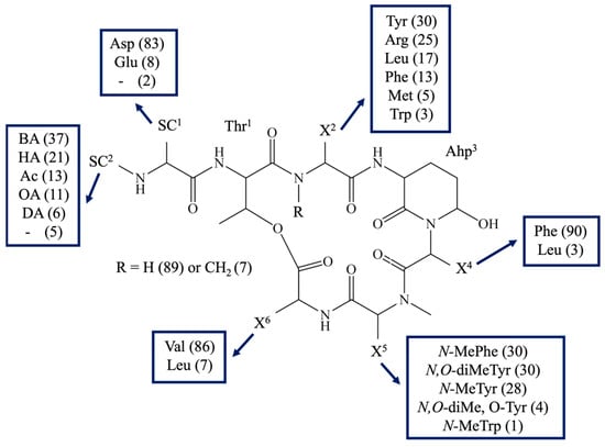 The structural diversity of these compounds is a consequence of their biosynthetic pathway. Biosynthesis is carried out on large enzymatic complexes called non-ribosomal peptide synthetases (NRPS). One cyanobacterial strain can produce a mixture of non-ribosomal peptides with modifications in different positions of their structure [,]. Typically, all CPs consist of a six-amino acid cyclic part closed by an ester bond between the b-hydroxy group of the residue in position 1 and the carboxy-group of the residue in position 6 (Figure 1, Table S1 [,,,,,,,,,,,,,,,,,,,,,,,,,,,,,,,,,,,,,,,,,,,,,,,,,,,,,,,,,,,,,,,,,,,,,,,,,,,]). Most CPs have a side-chain composed of 1–4 units attached to the residue in position 1, usually occupied by Thr (221/227), optionally, by 3-hydroxy-4-methyl-proline (Hmp) (4/227) [] or O-Hmp (2/227) []. A common feature of all cyanopeptolins is the presence of 3-amino-6-hydroxy-2-piperidone (Ahp) or its methylated form in position 3 (Figure 1). Position 5 is occupied by methylated aromatic amino acids, mainly tyrosine or phenylalanine. In some cases, the aromatic amino acid is chlorinated or brominated [,,,,,]. Position 6 is quite conserved and mainly occupied by Val, Leu, or Ile. In one CP variant, this position is occupied by Gln, and in one by Ala. High structural variability of CP-like depsipeptides is also evident in a wide range of molecular masses of the compounds: from 770 Da for tasipeptin A [] to 1181 Da for oscillapeptin B [].