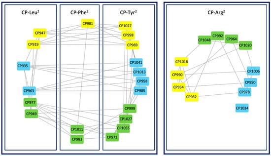 These 32 CPs were grouped into two main clusters based on the similarity of fragmentation pattern profiles being a consequence of their specific structural traits (Figure 9). The Arg2-bearing CPs were distinctly separated from variants with Tyr2, Leu2, or Phe2, which showed higher similarity to each other. This grouping might result from the fact that, unlike CPs with Arg2, the three types of CPs gave dehydrated ions as parent ions in their spectra. In both clusters, the CPs with different amino acids in position 5 grouped separately. Visualization of the structural relationships between CPs using a molecular network yielded consistent results with manually performed structural analysis of MS/MS data.