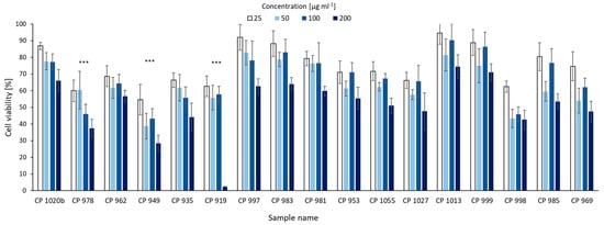 The cytotoxic activity of two CPs produced by CCNP1411, CP 962 with Arg2, and CP 985 with Tyr2, was previously tested against a breast cancer cell line and no effects were observed, even at 500 µg × mL−1 []. In the current study, the activity of 17 isolated CPs against a human cervical cancer (HeLa) cell line was assayed. Only for one of the free Arg2-containing CPs, CP 978, was the concentration-dependent reduction in cell viability significant (Figure 10). At the highest concentration (200 µg × mL−1), the cell viability was 62.5% (SD = 5.35) lower than in the control. Significant effects were also observed for Leu2-containing CPs, especially CP 949 and CP 919, which at 200 µg × mL−1 reduced cell viability by 71.5% (SD = 4.92) and 97.6% (SD = 0.12). Other CPs had no effect on cancer cell proliferation. The cytotoxic effects of CP-like peptides have been rarely reported. Among the few examples there are: symplocamide A that affected H-460 lung cancer cells and neuro-2a neuroblastoma cells [], tasipeptins A and B cytotoxic to KB human epithelial carcinoma cells [], molassamide inhibiting the elastase-mediated migration of breast cancer cells [], and kyanamide which was moderately cytotoxic to HeLa S3 cells []. The majority of the cytotoxic CP-like peptides belong to Leu2 or Abu2 bearing analogues and elastase inhibitors, suggesting that these amino acids are critical for activity against both targets.
