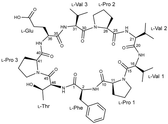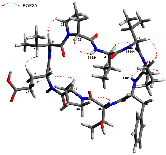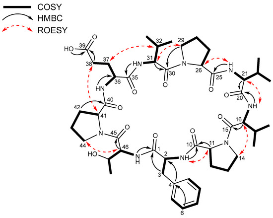 The HSQC spectrum of displayed the presence of thirteen methine carbons (δc 66.9–30.1), twelve methylene carbons (δc 47.3–23.8), and seven methyl carbons (δc 19.2–18.1) present. The available data indicate that 1 is a peptide composed of nine amino acids, including phenylalanine (Phe), threonine (Thr), glutamic acid (Glu), three valines (Val1–3), and three prolines (Pro1–3) residues facilitated by the analysis of the 1H-1H COSY spectrum in conjunction with the HSQC and HMBC spectra. The amino acid residues were subjected to additional structural assignment and sequencing by using the data of HMBC and ROESY experiments. First, the HMBC correlations from 2-NH (δH 7.13) of Phe and H-11 of Pro-1 (δH 4.17) to C-10 (δC 169.2) confirmed the connectivity of Phe to Pro-1. The 1H-13C long-range correlation from H-16 (δH 4.18) to C-15 (δC 170.6) and the ROESY correlation between H-14a (δH 3.49) and H-16 established the sequence of Pro-1 to Val-1. The sequence of Val-1 to Val-2 was determined by establishing the HMBC correlations from the NH group of Val-1 (δH 7.79) and H-21 (δH 4.13) of Val-2 to C-20 (δC 170.8). The connectivity between Val-2 and Pro-2 was determined through the HMBC long-range coupling observed from the amide proton (δH 7.93) of Val-2 to C-25 (δC 171.4) of Pro-2 and the observed ROESY connection between the α-proton at position H-26 (δH 4.41) of Pro-2 and the proton of the amide group in Val-2. The amino acid adjacent to Pro-2 was identified as Val-3 based on the 1H-13C long-range correlation from the α-proton at H-31 (δH 4.28) of Val-3 to C-30 (δC 169.4) and ROESY correlation between H-29b (δH 3.64) of Pro-2 and H-31 of Val-3. Glu was connected to Val-3 by the ROESY correlation between H-32 (δH 1.92) and H-37a (δH 2.21) and the HMBC correlation from 31-NH (δH 7.81) to the carbonyl carbon C-35 (δC 170.5) of Glu. The connection between Glu and Pro-3 was established through the analysis of the ROESY correlation between H-38b of Glu and H-41 (δH 4.43) of Pro-3. The connection between Pro-3 and Thr was determined by the use of ROESY analysis revealing a coupling between H-44a (δH 3.72) of Pro-3 and the α-proton (δH 4.38) of Thr. Based on the HMBC correlations from 46-NH (δH 8.17) of Thr and the α-proton (δH 3.08) of Phe to the carbonyl carbon (δC 172.2) of Phe, the final peptide residue, Thr, was located adjacent to Phe deducing the macrocyclic ring connecting Phe to Thr. Additionally, the confirmation of the amino acid residue sequence was substantiated by the ESIMS/MS experiment (Figure S14). Based on the chemical formula’s indication of 18 unsaturated number, the aforementioned data suggests the existence of a cyclic nonapeptide (Figure 3 and Figure 4).