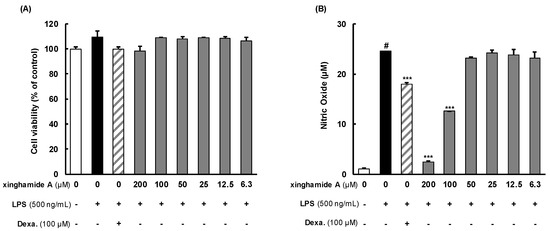 Effects of xinghamide A (1) on cell viability and nitric oxide secretion in lipopolysaccharide (LPS)-induced RAW264.7 cell. (-): DMEM treated groups, (+): LPS-treated group or Dexamethasone (Dexa.)-treated group. (A) RAW264.7 cells (0.5 × 105/well) pre-treated with xinghamide A at a concentration of 6.3, 12.5, 25, 50, 100, or 200 μM for 2 h and LPS (500 ng/mL) for 22 h. Cell viability was determined by using EZ-cytox reagent as described in the method sections. (B) RAW264.7 cells (0.5 × 105/well) pre-treated with xinghamide A at a indicated concentrations for 2 h and LPS for 22 h. Cell supernatants were harvested, and nitric oxide production was analyzed by Griess reagents. Dexa was used as a positive control. All data were calculated mean ± SD of duplicate. # p < 0.0001 compared to control and *** p < 0.0001 compared to LPS-treated groups.