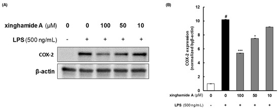 Effects of xinghamide A (1) on COX-2 expression in LPS-induced RAW264.7. (A) RAW264.7 cells (1 × 106/well) pre-treated with xinghamide A at a concentration of 10, 50, or 100 μM for 2 h and LPS (500 ng/mL) for 22 hr. COX-2 expression was evaluated using immuno-blotting with the specific COX-2 antibody. (B) Bar graph of the intensity of western blot bands visualized using Image J software (version (x64)1.8.0). All data were calculated mean ± SD of duplicate. # p < 0.0001 compared to control and *** p < 0.0001 and * p < 0.05 compared to LPS-treated groups.