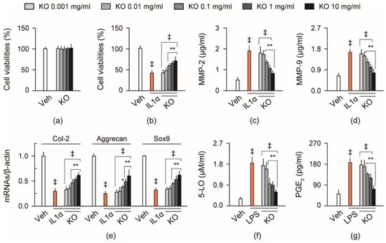 Rat chondrocytes were isolated from knee cartilage, as described previously [59]. Briefly, cartilage was dissected from the subchondral bone and minced into approximately 1~3 mm3 pieces. The tissue was then digested using 0.2% pronase (Sigma-Aldrich, St Louis, MO, USA) for 0.5 h at 37 °C and 0.1% collagenase (Sigma-Aldrich) for 4 h at 37 °C. The chondrocytes were collected after brief centrifugation and cultured in Dulbecco’s modified Eagle’s medium supplemented with 100 U/mL penicillin, 100 mg/mL streptomycin, and 0.25 mg/mL amphotericin B (all from Life Technologies, Carlsbad, CA, USA), in a 37 °C humidified incubator with 5% CO2. The culture medium was changed every other day. Cells were passaged or seeded at 80% confluency and within five passages. They were seeded on a 24-well plate (2 × 104 cells/well for cell viability and for 5-LO activity and PGE2 level; 5 × 104 cells/well for MMP level; 5 × 106 cells/well for gene expressions), and cultured overnight. The cells were treated with KO at five doses of 0.0001, 0.001, 0.01, 0.1, and 1 mg/mL in the culture medium containing 2% fetal bovine serum for 24 h. Cell injury and inflammation were induced by recombinant human IL1α at 5 ng/mL and LPS at 50 μg/mL, respectively [59]. The cell culture supernatants were collected for biochemical analyses of 5-LO, PGE2, and MMPs, and the cells were harvested for chondrogenic gene expression analysis.